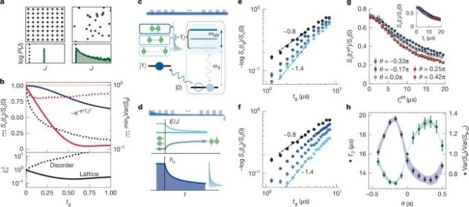 然而,事情并沒有想象中那么簡單。由于NV色心在晶格中的位置是隨機(jī)的,常常會(huì)形成一些“強(qiáng)耦合二聚體”,它們的動(dòng)力學(xué)遠(yuǎn)快于整體體系。這些“團(tuán)伙”帶來的后果是:集體自旋長度快速衰減,卻對(duì)投影噪聲的降低幫助不大。結(jié)果就是,雖然看到了噪聲減小,但量子擠壓參數(shù) ξn² 卻始終大于1,無法證明真正的糾纏增強(qiáng)(圖3a,b)。為了解決這一瓶頸,團(tuán)隊(duì)設(shè)計(jì)了兩種“格點(diǎn)工程”方法(圖3c,d):一種是通過頻率選擇性微波脈沖,把強(qiáng)耦合的二聚體“隔離”到不參與動(dòng)力學(xué)的能級(jí)(shelving);另一種是施加強(qiáng)橫場(chǎng)并緩慢退火,讓二聚體發(fā)生絕熱去極化(depolarization)。這兩種方式,本質(zhì)上都是要“清除掉攪局者”,只保留更有序的子群體參與擠壓過程。實(shí)驗(yàn)數(shù)據(jù)顯示,這樣的處理顯著延緩了自旋衰減(圖3e,f),而剩余自旋群體的投影噪聲仍然能正常剪切,呈現(xiàn)出標(biāo)準(zhǔn)的橢圓分布(圖3g,h)。這意味著,困擾多年的“無序詛咒”終于被部分破解。