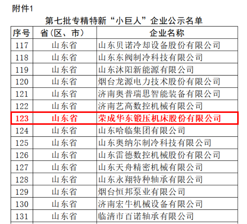 近日,山東省工業(yè)和信息化廳公布《關(guān)于山東省第七批專精特新”小巨人”企業(yè)名單公示》,榮成華東鍛壓機(jī)床股份有限公司憑借其在金屬成形機(jī)床高端裝備領(lǐng)域突出的創(chuàng)新能力、技術(shù)實(shí)力和市場(chǎng)地位,成功入選。這一國(guó)家級(jí)榮譽(yù)的獲得,標(biāo)志著榮成華東鍛壓機(jī)床股份有限公司在專業(yè)化、精細(xì)化、特色化、新穎化的發(fā)展道路上取得里程碑式的成就。